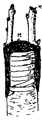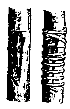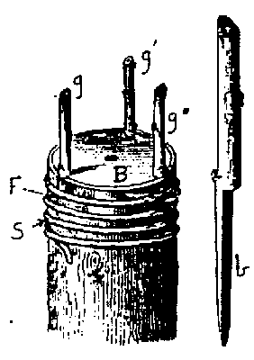 Bildo-6: Krona grefto kun tri greftaĵoj (g, g', g"), B: bazotigo. F: Ŝeloentranĉo. S: stringaĵo. Dekstre: plurburĝona greft-aĵo kun ĝia pinta bevelo (b).