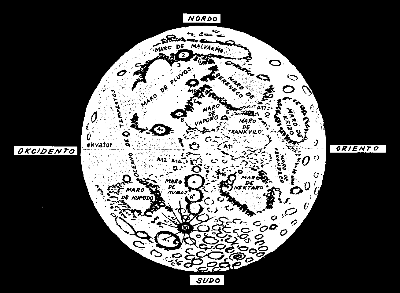 La desegnaĵo montras nian Lunan kun la plej karakterizaj »maroj« kaj krateroj. Interalie, oni bone rimarkas (dekstre supre) da »Maron de krizo« kie »Luna 24« prenis la specimenojn de Luna interno. Aliaj literoj kaj ciferoj sur desegnaĵo signifas: A 11, A 12, ktp montras la lokojn, kie allunĝis la ekipoj el kosmoŝipoj »Apollo«. La aliaj historiaj lokoj sur la Luno estas signitaj per sekvaj numeroj : 1— la loko kie alluniĝis la unua sovetia raketo, kiu ĝenerale, kiel unua tera korpo, atingis la Lunon, 3 — la loko kie »manovris« Lunohod 1. La krateroj kaj montaroj estas signitaj per sekvaj ciferoj : 2 — Platono, 4 — Koperniko, 5 — Boŝkoviĉ, 6 — Alpoj, 7 — Apeninoj, 8 — Eratosteno, 9 — kratero Alfonso (en kiu aperis »vulkano«) 10 — Tiho (unu el plej rimarkindaj krateroj), 11 — Leibnitz (la plej alta montaro sur la Luno — pli alta ol Monto Everest sur la Tero).