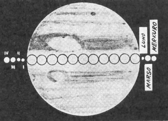 Nun ni scias, ke giganta planedo Jupitero posedas eĉ 14 satelitojn (— ĝis antaŭ nelonge en plimulto de astronomiaj faklibroj estis notite ke Jupitero posedas 12 satelitojn…) La desegnaĵo montras: maldekstre estas 4 plej grandaj Jupitero-satelitoj (I, II, III kaj IV). Dekstre estas kompara grando — de la Luno, Merkuro kaj Marso, el kio oni povas evidente konkludi, ke la plej granda Jupitera satelito estas eĉ pli granda ol planedo Merkuro! Meze, en la globo, prezentanta Jupiteron mem, vi vidas 11 malgrandajn globetojn: ĉiu globeto estas — grando de nia Tero kompare kun grando de giganta planedo Jupitero!