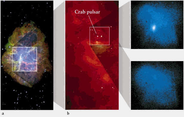La kraba nebulozo kaj ĝia pulsaro (dekstre supre: dum pulso, sube: sen pulso)".