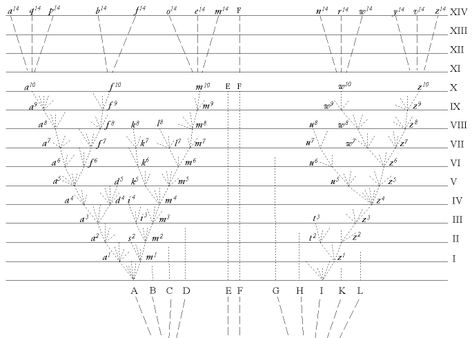 La malgranda ventumilo de diverĝantaj malegalaj punktolinioj kiuj eliras de (A) reprezentu ĝiajn variantajn idojn. La varioj estu ekstreme malgrandaj, sed de plej diversa speco; ili ne necese aperas ĉiuj samtempe, sed ofte post longaj intervaloj de tempo; kaj ili ne necese daŭras dum egalaj periodoj. Nur tiuj variaĵoj kiuj estas iel avantaĝaj konserviĝas aŭ nature selektiĝas. Kaj jen la punkto kie la principo pri la avantaĝo derivita de trajtodiverĝo fariĝas grava; ĉar ĉi tio ĝenerale kaŭzas ke la plej malsamaj aŭ diverĝintaj variaĵoj (reprezentitaj per eksteraj punktolinioj) estas konservitaj kaj akumulitaj per natura selektado. Kiam punktolinio atingas unu de la horizontalaj linioj, markitaj per malgranda numerita litero, sufiĉa kvanto da vario akumuliĝas por formi bone distingitan variaĵon, tiel ke ĝi estus registrinda en sistema verko. La intervaloj inter la horizontalaj linioj en la diagramo, povus reprezenti mil generaciojn; sed estus pli bone se ili reprezentus dek mil generaciojn. Post mil generacioj, specio (A) produktus du sufiĉe distingitajn variaĵojn, nome a1 kaj m1. Ĉi tiuj du variaĵoj ĝenerale daŭre spertus la samajn kondiĉojn kiuj estus variigintaj iliajn praulojn. Ĉar variemo mem estas hereda, ili emus varii, kaj ĝenerale varii laŭ preskaŭ la sama maniero kiel iliaj prauloj estus variintaj. Plie, ĉi tiuj du variaĵoj, estantaj nur iomete modifitaj formoj, emus heredi tiujn avantaĝojn kiuj estus farintaj ilian komuna generinton (A) plinombra ol la plejo de aliaj enloĝantoj de la sama lando; ili same havus tiujn pli ĝeneralajn avantaĝojn kiuj estus farinta la genron de la praspecio granda genro en ĝia propra lando. Kaj oni scias ke ĉi tiuj cirkonstancoj estas favoraj por la produkto de novaj specioj. Nu, se ĉi tiuj du variaĵoj estus variemaj, la plej diverĝantaj de siaj variaĵoj ĝenerale konserviĝus dum la sekvanta mil generacioj. Kaj post ĉi tiu intervalo, variaĵo a1 en la diagramo estus produktinta variaĵon a2, kiu, pro la principo de diverĝo, diferencus pli de (A) ol a1 estus farinta. Variaĵo m1 estus produktinta du variaĵojn, nome m2 kaj s2, kiuj diferencus de si, kaj pli konsiderinde de sia komuna generinto (A). Oni povas daŭrigi la procedon per similaj paŝoj dum ajna periodo; iuj variaĵoj, post ĉiu milo da generacioj, produktus unu nuran variaĵon, sed en pli kaj pli modifita kondiĉo, iuj produktantaj du aŭ tri variaĵojn, kaj iuj produktantaj neniujn. Tiel la variaĵoj aŭ modifitaj praidoj, devenantaj de la komuna praulo (A), ĝenerale plinombriĝadus kaj diverĝadus en karaktero. En la diagramo la procedo estas reprezentita ĝis la dekmila generacio, kaj laŭ kompakta kaj simpligita formo, ĝis la dekkvarmila generacio. Sed mi devas diri ĉi tie ke mi ne supozas ke la procedo ĉiam iras tiom regule kiel estas reprezentite en la diagramo, kvankam ĝi mem estas iom malregula. Mi apenaŭ pensas ke la pli diverĝintaj variaĵoj neeviteble venkas kaj plinombriĝas: meza formo povas longe daŭri, kaj eble aŭ eble ne produktos pli ol unu modifitan praidon; ĉar natura selekto ĉiam agos laŭ la naturo de la lokoj kiuj estas aŭ neloĝataj aŭ neperfekte loĝataj de aliaj estaĵoj; kaj ĉi tio dependas de senfine komplikaj rilatoj. Sed ĝenerale, ju pli diversiĝinta laŭ strukturo la praidoj de iu specifa specio fariĝas, des pli da lokoj ili kapablos okupi, kaj des pli iliaj modifitaj idoj plinombriĝos. En la diagramo, la linio de sukcedo estas rompita laŭ regulaj intervaloj per malgrandaj numeritaj literoj kiuj markas la sinsekvajn formojn kiuj ekfariĝas sufiĉe distingitaj por esti registritaj kiel variaĵoj. Sed ĉi tiuj rompiĝoj estas imagitaj, kaj povus esti enmetitaj ie ajn, post intervaloj sufiĉe longaj por permesi la akumuladon de konsiderinda kvanto da diverĝinta vario. Ĉar ĉiuj modifitaj praidoj de komuna kaj larĝe disvastiĝinta specio, apartenantaj al larĝa genro, emas havi la samajn avantaĝojn kiuj faris sian gepatron sukcese en vivo, ili ĝenerale daŭrigos sian plinombriĝon kaj diverĝon de karaktero: ĉi tio estas reprezentita en la diagramo per la pluraj diverĝintaj branĉoj elirantaj de (A). La modifitaj idoj de la postaj kaj pli alte plibonigitaj branĉoj en la linioj de deveno, probable ofte anstataŭos, kaj tiel detruos, la pli fruajn kaj malpli plibonigitajn branĉojn: ĉi tio estas reprezentita en la diagramo per tio ke iuj malsupraj branĉoj ne atingas la suprajn horizontalajn liniojn. En iuj kazoj mi ne dubas ke la procedo de modifo estas limigita al unu linio de deveno, kaj ke la nombro da praidoj ne plinombriĝas; kvankam la kvanto de diverĝa modifo eble kreskis en la sinsekvaj generacioj. Ĉi tiu kazo estus reprezentita en la diagramo, se ĉiuj linioj elirantaj de (A) estus forigitaj, escepte de tiuj de a1 ĝis a10. Laŭ la sama maniero, ekzemple, la angla kurĉevalo kaj angla montrohundo verŝajne ambaŭ daŭre kaj malrapide diverĝis en karaktero de siaj originalaj formoj, sen krei novajn branĉojn aŭ rasojn. Post dek mil generacioj, specio (A) estus produktinta tri formojn, a10, f10, kaj m10. Ĉar ĉi tiuj formoj estus diverĝintaj en karaktero dum sinsekvaj generacioj, ili multe, eble malegale, diferencus de si kaj de sia praspecio. Se ni supozus ke la kvanto da ŝanĝiĝo inter ĉiu horizontala linio en la diagramo estus ekstreme malgranda, ĉi tiuj tri formoj ankoraŭ estus nur bone markitaj variaĵoj; aŭ ili eble atingus la dubindan kategorion de subspecio; sed oni devus nur supozi ke la paŝoj en la proceso de modifo estas pli multaj aŭ kvante pli grandaj, por konverti ĉi tiujn tri formojn al bone distingitaj specioj; tiel, la diagramo ilustras la paŝojn per kiuj la malgrandaj diferencoj kiuj distingas variaĵojn kreskas ĝis la pli grandaj diferencoj kiuj distingas speciojn. Daŭrigante la saman procedon dum pli granda nombro da generacioj (kiel montrita en la diagramo laŭ kompakta kaj simpligita maniero), oni akiras ok speciojn, markitajn per la literoj i