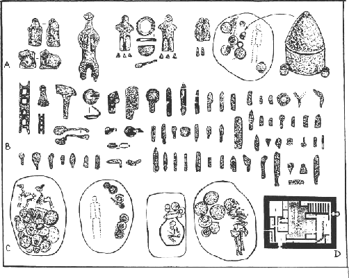 Bildo 4. Ĝarkutana templo de fajro (D) kaj la ritaj variaĵoj en la imita rito de la Sapalli-kulturo.