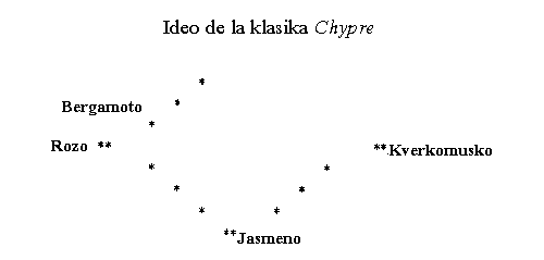Ni vidis antaŭe la komponadon laŭ la odorprofilo, do laŭ la sinsekva svenado. Nun ni rigardas — iomete — la komponadon laŭ la odora tendenco de la komponaĵoj, kiun ni provas rilatigi al la odorefika skemo de Jellinek. La ekzemplo estu la famekonata Chypre de Coty (1917). {Sed necesas diri, ke multaj Chypre-tipoj ekzistas, ĉar ĉiu parfumisto provas nove krei tiun parfumtipon, kaj ankaŭ en pli novaj parfumtipoj la ideo de la tipo Chypre estas ekkonebla}.