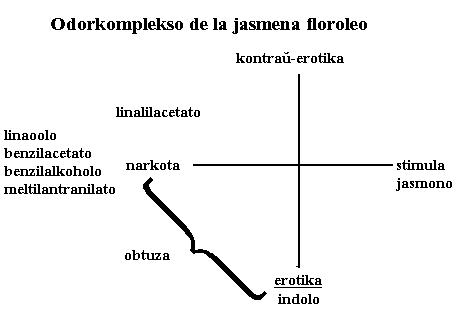 Bazo de multaj parfumkreaĵoj estas la jasmena odoro. Natura jasmena floroleo estas unu el la gravaj odorkomplekso en la parfumoj de la tipo "franca"; la jasmena esenco absoluta el la pomado entenas 2,5 % da indolo, kiu portas preskaŭ fekan odoron; tiom procentoj da indolo estas tolerebla nur, se ili estas ruze kaŝitaj en natura odoraĵo.