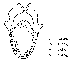 La lango ankoraŭ direkte perceptas la sensimpresojn el la likvoza medio, sed kune kun la palato ĝi informas nin nur pri kvar gustoj: dolĉa — sala — acida — amara laŭ sinsekvo agrabla, kaj laŭ sinsekvo de kreskanta sentiveco.
