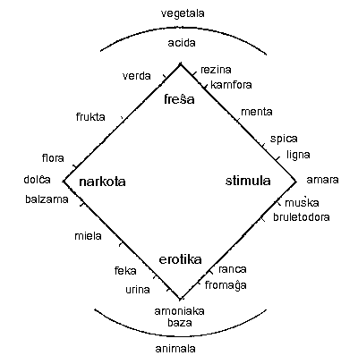 Odoroj reprezentiĝas kiel korpoj (esprimo ĉe la vingustado!) kun verticoj, eĝoj, edroj kaj enhavo. Pro tio diversaj odoroj ne nuliĝas, sed nur pli malpli harmonie miksiĝas antaŭ ol ili disflugas unu post la alia laŭ volatileco.