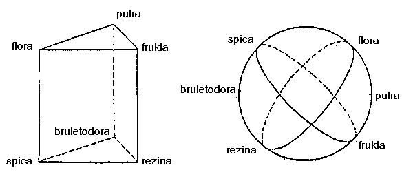 ĝenerale oni rimarkas, ke la lingvo ne posedas vortojn pri odorkvalitoj, sed nur komparajn, priskribajn esprimojn. Ses karakterizaj odoroj staras ĉe la verticoj (flora, spica, rezina, bruletodora, frukta, putra). Sur la eĝoj troviĝas odorvicoj. Tra la edroj pasas odorserioj de variaj koncentrecoj. Teorie troviĝus ĉiuj tiam konataj odoroj sur la kvin surfacoj de la kvinedro (pentaedroprismo).