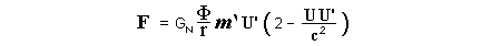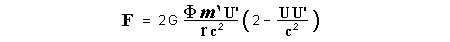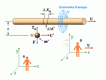 ![]() Se c estas la lum-rapido en vakuo, pro la Speciala Teorio de Relativeco, ni scias ke la rapideco U'' de la objekto W relativa al observanto B, skribita kun bazo en la rapidoj U kaj U' estas: ![]() Pro tio, ke neniu rapido povas superi la lum-rapidon en vakuo, sen perdo de ĝeneraleco ni povas esprimi la rapidojn kiel frakcioj de la lum-rapido, tiel ke eblas uzi angulaj funkcioj, jene: ![]() Laŭ tiuj difinoj de alfa, beta kaj gamma, validas la sekvantaj rilatoj: ![]() kaj aplikante tion a la rilato [1] ni atingas: ![]() Kaj, pro la fakto ke: Do, anstatŭiginte kaj transforminte, ni sekve atingas: ![]() Nu, ankaŭ veras ke: Do, anstataŭiginte ni alvenas al: ![]() Pensu ni nun pri eta ero de maso apartenanta al la fluo. Tiu ero posedas, laŭ mezuroj de A, longo delta de XA kaj maso delta de M'. Do, la observanto A povas difini la linea denseco de la fluo kiel: ![]() Nu, se delta de M estas la maso en kvieteco (kiel mezurita far B) de la ero de fluo, ni scias ke la maso delta de M' laŭ mezuro far A rilatiĝas kun tiu maso en kvieteco, laŭ Speciala Relativeco, jene: ![]() do, la linea denseco por A ankaŭ estas: ![]() Krome, pro la longo-kurtigo de Lorentz, la longo delta de XA laŭ mezuro de observanto A rilatiĝas kun la koresponda longo en kvieteco delta de XB (laŭ mezuro far B) per la esprimo: Kaj do, esprimita per la kvietecaj maso kaj longo de la flu-ero, laŭ mezuro far B, la linea denseco mezurita far A estas: ![]() Kaj pro tio ke la linea denseco mezurita far B, kvieta relative al la flu-ero, estas: ![]() Do, la rilato inter la lineaj densecoj mezuritaj far A kaj far B estas: ![]() Konsideru ni nun la gravitan kampon kreita far la maso kiun A perceptas kiel "fluo". Se ni supozas ke la longo de tiu maso en la direkto de U estas multege pli granda ol la distanco r, ni vidas ke la intenso de la gravita kampo NB, je la distanco r, mezurita far la observanto B, kvieta relative al tiu maso, estas tia kaŭzita far maso de grandega longo kaj eteta dikeco: ![]() kie G estas la Gravita Konstanto Nu, relative al observamnto B, la objekto W, de kvieteca maso m, posedas maso: ĉar W moviĝas relative al B kun rapido U''. Laŭ tio-ĉi, la forto TB sur m'' kaŭzita far la kvazaŭlineeca distribuo de materio, estas, laŭ mezuro far B: kio egalas al: Kaj simile, en la inercia referenca sistemo de A, la intenso de la gravita kampo NA, je la distanco r, havas amplekson: kiu, anstatŭigante laŭ la rilato [3] devenas: kaj, pro tio ke relative al A, la maso de W estas m', la gravita forto sur W, mezurita far A estas: ![]() kaj ĉar la maso m', rilatiĝas kun la kvieteca maso jene: ni alvenas al: ![]() kio, pro la rilato [4] facile transformiĝas en: kio, pro la rilato [2] egalas al: Kaj pro la trigonometria malegaleco: ni facile konkludas ke que validas la sekvanta malegaleco inter la fortoj sur W mezuritaj far A kaj far B: El la rilato [6] ni atingas: Krome, laŭ la transformado de fortoj de la Speciala Relativeco: Se P estas la plena transversa forto sur iu objekto W, de kvieteca maso m (kia mezuras ĝin observanto kvieta relative al W), do, la plenajn transversajn fortojn PA kaj PB, mezuritaj far observantoj kiuj moviĝas relative al W, kiel A kaj B, oni atingas per la ekvacioj: kiujn ni povas kombini en: ![]() kaj, anstatŭigante la denominatoro laŭ [2] transformiĝas en: ![]() Por la observanto B, la plena forto inter la lineeca maso kaj W etas nur tiu gravita, jene: kaj do: ![]() Kaj se ni komparas tiu-ĉi lastan esprimon [8] kun esprimo [6], ni vidas ke en la ĝenerala okazaĵo PA ne egalas al TA Kio kondukas ni al konkludo ke por la observanto A ekzistas alia forto ne perceptebla far B kaj kontraŭa al tiu gravita TA, tiel ke la plena forto mezurita far A estas:kio pro la rilato [8] transformiĝas en: ![]() kaj pro la rilato [7] devenas: ![]() Nun ni povas anstataŭigi la forton TA per la produto de: la kampo NA kaj la maso m', kaj ni atingas: kio, pro la rilato [5] egalas al: Se ni difinas la flua intenso kiel kvanto de maso iranta dum ĉiu tempunuo: Do, la linea denseco mezurita far A, konsiderante diferencialan eron, povas transformiĝi jene: ![]() kaj do: kio se ni reesprimas per la rapidoj, estas: Kaj, se ni difinas la "Gravnetan Konstanton" GN kiel: ni povas esprimi la "Gravnetan Forton" kiel: Ligo: Projekto VIRGO por detektado de gravitogravnetaj ondoj Kopirajto © 1988-2008 Luis Guillermo RESTREPO RIVAS, Ĉiuj Rajtoj Rezervitaj |