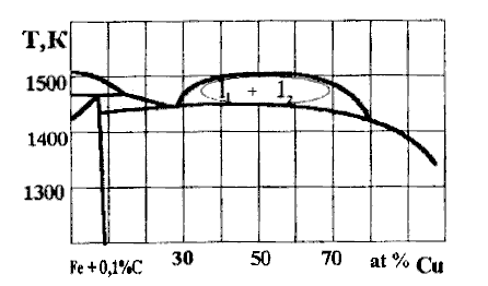 en tuta kontcentriteca intervalo, kio konformas senliman reciprokan solvadon de la fero kaj kupro en likva stato. Dum plimalaltigo de temperaturo entropia faktoro malgrandiĝas kaj kun eĉ negranda kvanto da karbono en koncentriteca kurbo de Gcm aperas parto kun minusa kurbeco (vidu fig. 6), kio ja atestas distavoliĝon.