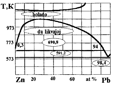 | Fig.7. Diagramo de ekvilibro de sistemo Zn-Pb | Fig. 8. Diagramo de ekvilibro de sistemo Cu-Pb |