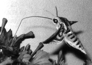 Tiuj reguloj ankoraŭ pli validas por la makrofotado, t.e. fotado de proksimaj objektoj aŭ estaĵoj. Tre malfacile fotebla estas tiu specio de rapidege kaj senĉese fluganta dika vespera papilio, fakte unu el la kvindeko da ekzistantaj sfingoj, kies precizan nomon eble iuj legant(in)oj konas? Per sia longega rostro, ĝi rikoltetas la polenon en floroj de mirabilo (Mirabilis), kiu floras nur nokte ekde la vespero. Feliĉe, la ciferecaj aparatoj ne devigas al ŝparo, kaj, sekve, ili ebligas foti multfoje kaj elekti la malplej malbonan foton kaj forviŝi la troajn el la memorkarto. Tiu ĉi bildo estas iom plibonigita per du komputilaj programoj, unu por forigo de la «ruĝaj okuloj», t.e. fenomeno, kiu rezultas el uzo de fulmilo, kaj alia por iom heligi kaj kontrastigi la tutan bildon ĉar, nigreblanke, ĝi aspektus malpli neta kaj tro malhele griza. Malgraŭ tio, oni neniam forgesu ankaŭ, ke foto teknike kaj estetike perfekta povas tamen esti seninteresa!