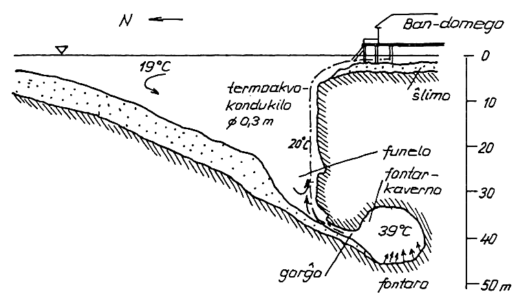 La ĉirkaŭ 50 metrojn longa termoakvo-proviza tubo, kies diametro estas 0,30 m, kapablas liveri multe pli. Nome la horizontala kaj la ĉ. 30 metrojn longa vertikala sekcioj de la tubo estas ĉirkaŭataj de akvo kun averaĝa temperaturo de 20° C. La suba parto de la tubo estas ĉirkaŭata de averaĝe 38,5-grada akvo. En la tubo la averaĝa temperaturo estas 38,5° C. La koncernaj densoj
