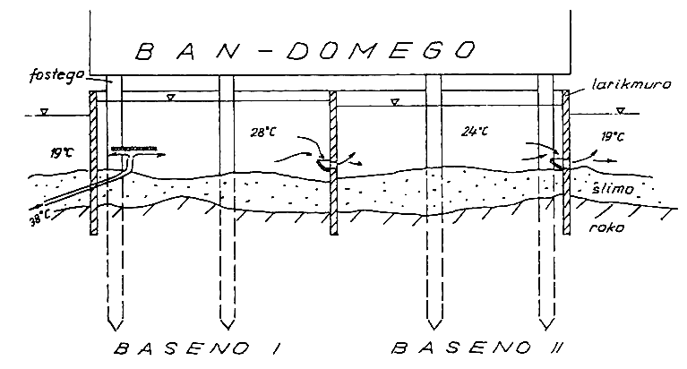 La enkonduko de la termoakvo al baseno I estos tia ke ĝi laŭeble bone miksiĝu kun la ĉirkaŭa akvo, ĉar se la varma akvo flosus sur la supro, la varmoperdo estus pli granda. La transfluo al la alia baseno kaj de tie al la libera akvospaco okazas tra horizontale longaj, vertikale mallarĝaj aperturoj en la muroj. Tiamaniere la retrofluo de la malvarma akvo estas ekskludita. Estos en la muroj aŭtomate fermiĝantaj pordoj, kiujn la naĝantoj facile malfermos kaj ili povos transnaĝi el unu baseno al la alia aŭ al la libera akvospaco de la lago. Somere certaj partoj de la muro estas forigeblaj, do libera naĝado el la lago sub la bandomegon kaj retro estos plifaciligita.