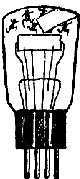 ![]() | Fig. 6. — 1. Ĝenerala aspekto de moderna radiolampo. — P, plato (aŭ anodo); G, krado (aŭ helpanodo); F, filamento (aŭ inkandeskanta katodo); B, kontaktiloj. La tri elektrodoj (plato, krado, filamento) estas entenataj en vitra ampolo sfero-, piro- aŭ cilindroforma, kiun subtenas metala aŭ izola cilindra ampolingo. Ĉe la malsupra parto de l' ampolingo elstaras ordinare kvar metalaj stangetoj, la kontaktiloj. Du estas interne konektitaj kun la ekstremaĵoj de la filamento, unu kun la krado, la alia kun la anoda plato. Ilia kutima lokigo estas montrita en II. La lampo estas en la skemoj reprezentata per la simbolo III. |