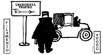 RAD.Vi vidas, ke la lampo lasas la elektronan kurenton nur en unu direkton: de l' filamento al la anodo. Sekve ĝi efikas, kiel klapo, kaj tial ĝi estas nomata elektrona valvo. Sed kion vi denove faris?...