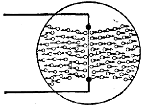 ![]() | Fig. 9. — La elektronoj dissenditaj de la filamento estas altirataj de la pozitiva anoda plato. Inter la filamento kaj la anodo ekzistas do efektiva elektra kurento tra la libera spaco. |