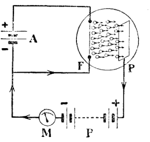 ![]() | Fig. 8. — Kiamaniere la filamento F, kaj la anoda plato P de radiolampo estas konektitaj kun siaj respektivaj baterioj: A, filamenta, aŭ varmiga baterio; B, anoda, aŭ plata baterio. La galvanometro M ebligas konstati, ke kurento fluas en la cirkvito: plato, anoda baterio, galvanometro, filamento kaj spaco inter la filamento kaj la anoda plato. |