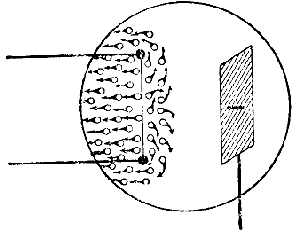 ![]() | Fig. 7. — La elektronoj elsaltas el inkandeskanta filamento. Kvankam ili estas absolute nevideblaj, ni prezentis ilin ĉi tie per kvazaŭ-fiŝetoj, kun kapo kaj vosto, por montri la direkton de ilia movo. |