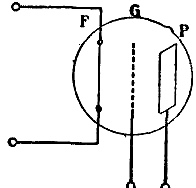 | Fig. 11. — La skemo de la trelektroda lampo. F, filamento; G, krado, P, anoda plato. | Fig. 12. — La elektronoj iras de l' filamento al la anodo, trapasante la kradon. |