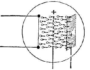 ![]() | Fig. 13. — La krado estas pozitiva rilate al la filamento. La elektronoj libere trapasas ĝin. La kurento do pli-intensiĝas. |