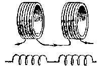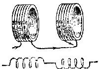 | Fig. 45. — Du bobenoj estas serie konektitaj tiamaniere, ke en ambaŭ la kurento rondiras samdirekte. Kiam oni proksimigas la bobenojn, ilia komuna memindukto pligrandiĝas. | Fig. 46. — Du bobenoj estas serie konektitaj tiamaniere, ke en ambaŭ la kurento rondiras malsamdirekte. Kiam oni proksimigas la bobenojn, ilia komuna memindukto malpligrandiĝas. |