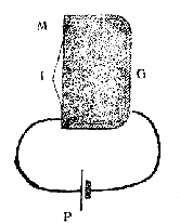 ![]() | Fig. 48. — Mikrofono. — La membrano M ripozas sur izoliga ringo I, kiu ĝin apartigas de la metala skatoleto B plenigita per karba grajnaro G. La kurento de la baterio P trairas la vojon B G M. |