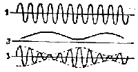 ![]() | Fig. 50. — Grafika prezento de telefona modulo. 1, altfrekvenca alterna kurento de heterodino. 2, rezistanco de mikrofono. 3, modulita kurento. |