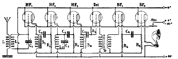| Fig. 81. — Skemo de ricevilo laŭ Scott-Taggart. La unua lampo estas kuplita kun la dua per agordita cirkvito, la dua kun la tria — neagordebla induktanco (kun fera kerno), la tria kun la kvara denove per agordita cirkvito. La kvara lampo estas detektoro (oni rimarku, ke la rezistaĵo ne ŝuntas la detektan kondensatoron, sed estas rekte kunligita kun la pozitiva poluso de la filamenta baterio). La kvina lampo estas malaltfrekvenca amplifikatoro transformatore kuplita. |