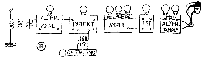 RAD.Tre bone! Do oni ĝuste tiel agas. Per loka heterodino (fig. 82), oni kreas oscilojn tiel, ke la diferenco inter ilia frekvenco de ondoj, kiujn kaptas la anteno, estu ĉiam egala al iu konstanta nombro, ekzemple 30,000. Do, se la frekvenco de iu sendstacio estas 1.500.000 (ondlongo 200 metroj), ni agordos la heterodinon je la frekvenco 1.470.000 aŭ 1.530.000. En ambaŭ okazoj la kurento rezultanta post interferenco havos la frekvencon 30.000. Tiu ĉi meza frekvenco estas jam oportune amplifebla. Ni povas fari por ĝi tri- eĉ kvarŝtupan mezfrekvencan amplifikatoron. kies resonancaj cirkvitoj povas ja unufoje por ĉiam esti bone agorditaj je la meza frekvenco. Post tiu ega amplifado en mezfrekvencaj ŝtupoj la kurento estas detektata kaj la rezultanta malaltfrekvenca kurento povas ankoraŭ esti amplifita. Ankaŭ la altfrekvenca kurento povas esti amplifita antaŭ la frekvencŝanĝo (fig. 82).