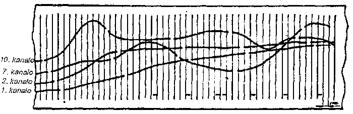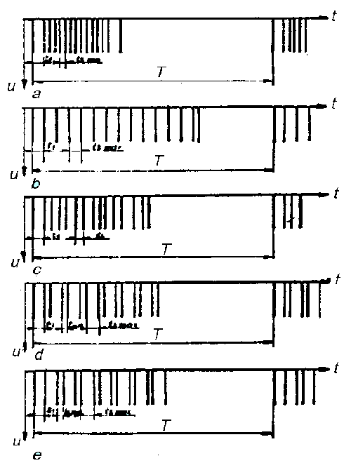 La principo de kodado sur magnetofonan bendon. Periodo T estas konstanta, 1/30 sek. Dum tiu ĉi daŭro registriĝas valoroj de ĉiuj parametroj. La registro okazas per impulsoj, kies reciprokaj distancoj dependas de mezurita valoro de la parametroj. Komence de ĉiu periodo troviĝas du impulsoj kun konstanta larĝeco kiel identifo de la periodkomenco. Grafikaĵoj: a) minimumaj valoroj de mezurataj parametroj; b)maksimumaj valoroj; c), d), e) diversaj kombinoj de valoroj de mezurataj parametroj.