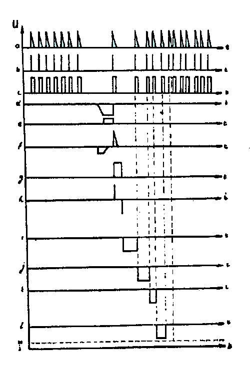 Maniero de dekodado de registro el magnetofonbendo pere de surtera dekodada aparato. Grafikaĵoj: a) la impulsoj transprenataj el magnetofonbendo; b), c) aranĝo de formo kaj amplitudo de la impulsoj; d) ĝis h) dekodado de parametra valoro laŭ larĝo de la impulso.