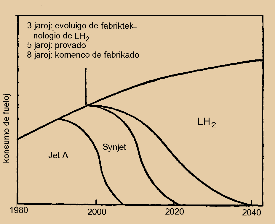 Utiligo de la fuelo “Synjet” estas planata nur portempe por 20 ĝis 30 jaroj (vidu la grafikaĵon). Ĝis fino de tiu ĉi jarcento oni devas konstrui fuelfarejojn, postulantaj altajn investajn elspezojn. Ankoraŭ pli altajn elspezojn kaj pli longan tempon por solvi la fabrikan teknologion kaj por konstruado de la fabrikoj postulos enkondukon de likva hidrogeno “LH2”, de la fuelo, kiu montriĝas kiel la plej taŭga anstataŭaĵo de fuelo (la aviada petrolo), laŭ la vidpunktoj de trafiksekureco kaj de sufiĉaj materialaj fontoj. Granda avantaĝo de “LH2” estas, ke ne malpurigas la vivmedion. Ĝia prezo estos probable pli alta ol nuntempa kosto de la fuelo “Jet A”.