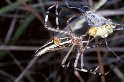 Radretaj araneoj kiel ĉi tiu Argiope syrmatica enpakas sian predon antaŭ ol ĝin manĝi. |