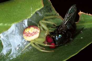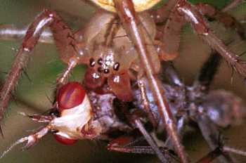 predon. Por mortigi la predon araneo uzas venenon. Ĉe la ekstremaĵo de la