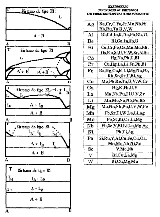 En fig. 1 skize estas montritaj diagramoj de stato de sistemoj, kiuj apartenas al klaso E kaj estas donitaj kelkaj ĉefaj ekzemploj de konformaj duoblaj kombinoj de komponantoj. Necesas rimarki, ke la vicon de ekzemploj ne trafis la plej multo el diverseblaj realaj sistemoj, kaj, konkrete, pluraj sistemoj de komponantoj kun distavoligo en likva stato, manko de reciproka solvado en solida stato, sed formantaj inter la komponantoj stekiometriaj kombinoj, iam eĉ pli ol du. Al similaj sistemoj apartenas, ekzemple, As-Ga, As-Sn, Li-Ga Cd-Tl, Cd-K Mn-S, Mn-Bi kaj multaj aliaj.