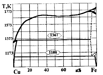 | Fig. 6. Pseŭdoduobla sekcado de diagramo de stato de sistemo Fe-Cu ĉe konstanta interrilato Fe:C |