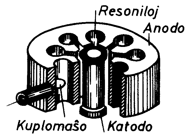 Sur figuro 1 estas ilustrita la konstruo de la magnetrono, kie per la litero K estas signita la cilindroforma inkandeska katodo. Ĝi estas cirkaŭigita per kupra anoda bloko, kaj en tiu anodringo situas resoniloj. La nombro (N) de la resoniloj ĉiam estas para, depende de la konstruo ĝi povas varii de N =8 ; ĝis N = 40. Inter la katodo kaj la anoda bloko situas la spaco de interago. Konstanta (permanenta) magneto (ne ilustrita sur fig. 1) estigas konstantan aksodirektan magnetan kampon. En unun el la resoniloj estas metita kuplomaŝo KM, servanta la eligon de energio de altfrekvencaj osciloj. Sur figuro 2 estas ilustritaj la plej ĝeneralaj formoj de la resoniloj: a – fendaĵkavo, b – fendaĵo, c – sektoro.