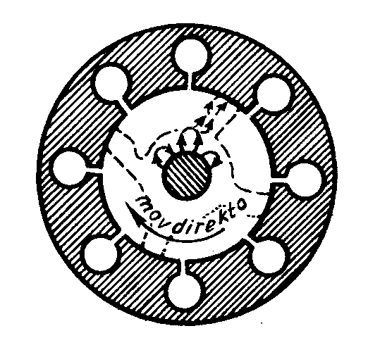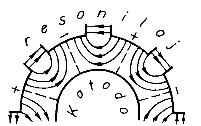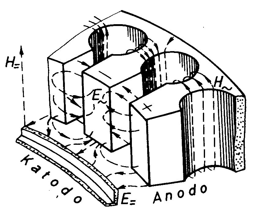 , ktp). Tial, laŭ dimensioj de la resoniloj oni povas havi informon pri la ondolongo, produktata fare de la magnetrono. Resonila sistemo de la magnetrono havas altan kvalitecon (bonecan a#365; kvalit-faktoron): Q = 700-1500, sed dum ŝarĝado ĝi malpliiĝas ĝis kelkaj centoj. Apartaj resoniloj de la anoda bloko havas komplikajn elektrajn interligojn. Ili estas interligitaj kondukte (galvane) per la segmentoj de la anoda bloko, per komuna magneta flukso kaj per komuna elektra kampo (figuro 3.).