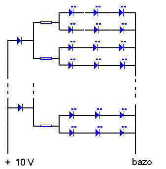 Vi povas vidi parton el la cirkvito sur la figuro 1. La tuta cirkvito estas nur multobligata de tiu strukturo de fuguro 1. Kiel vi povas vidi sur la figuro de cirkvito, eĉ kelkaj LED difektoj ne kaŭzas tutan mallumiĝon. Tiu difektiĝo estas ne videbla de la observanto, ĉar la diodoj en la rondforma reflektoro estas situitaj ne vice, sed zigzage. La efikecon de tiu reflektoro altigas ankaŭ tiu struktura elemento, ke la diodoj estas lokitaj ne rektlinie sur la panelo, sed ĉiu iom oblikve.