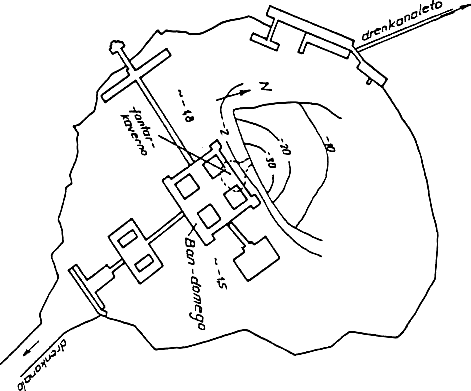 | Fig 2. Plano de la lago de Héviz kaj ties bankonstruaĵoj kun nivrllinioj de la fundo ĉirkaŭ la funelo. La ciferoj montras la profundecon en metroj. |