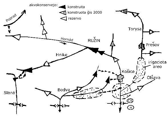 Sur la suba diagramo estas skemo de la akvomastruma sistemo de la riveroj Hornád kaj Bodva. Kiel konate, laŭ sistemteorio sistemo estas aro da elementoj kaj aro da rilatoj inter ili, kiu kondutas, kiel tuto, alcele, t. e. plenumas difinitajn taskojn. La elementoj de nia sistemo estas akvokonservejoj kaj transduktoj el rivero Poprad (kies akvo nature forfluas al Balta maro) al Hornád, inter Hornád kaj Bodva kaj de Hornád al rivero Slaná.