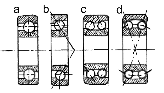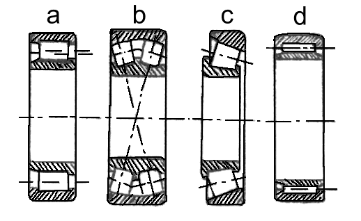 | Bildo 296. Rul-lagroj. a - unuvica b - unuvica kun oblikva kontakto kun duvica globlagro. c - duvica kun oblikva kontakto d - duvica klinebla globlagro |