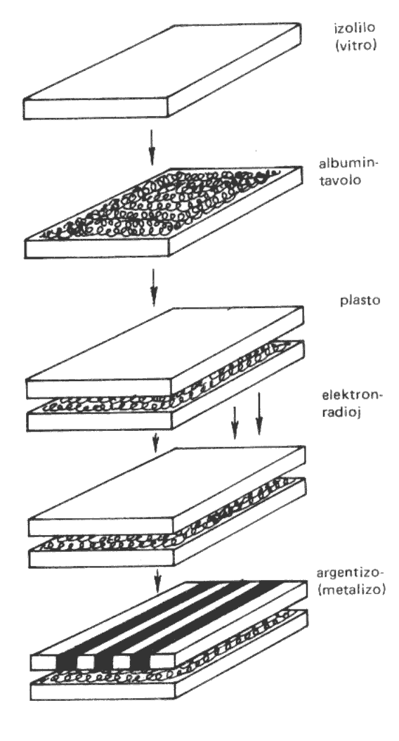 Por vidi la hodiaŭan realon, ni rigardu integritan biocirkviton patentitan de la firmao EMVA. Ili kovris vitran plateton per tavolo de polilizina albumino, kaj super tion oni metis tavolon de plasto. Helpe de elektrona radio oni determinis la lokon de la cirkvitoj. Post alkohola bano kaj arĝentizo jam estis preta la cirkvito. La apliko de albumino ebligis krei pli ol 100 mil elementojn sur unu lok-unuo, kaj la rapido estas proksime al tiu de la superkonduktiloj.