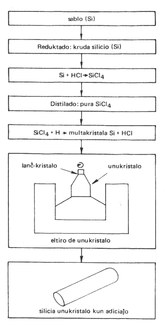 Komence oni reduktas la kvarcosablon per diversaj metaloj (A1, Mg, Zn),Akaj tiamaniere oni ricevas krudan silicion. Ĝi kompreneble ankoraŭ ne taŭgas por duonkonduktecaj celoj, ĉar ĝi estas malpura kaj ĝi ne estas unukristalo.