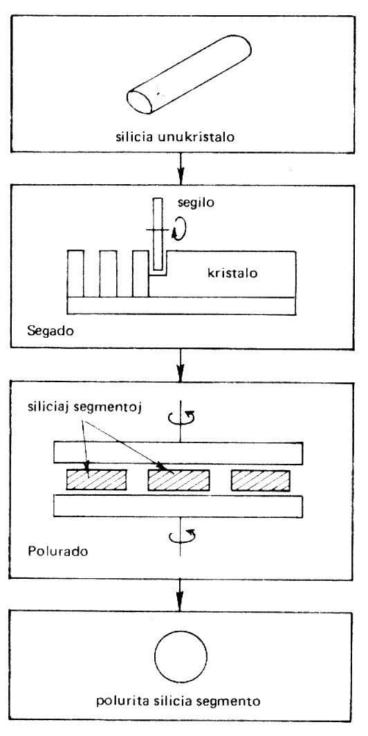Silicio estas malmola materialo, sed per specifa, diamanta segilo ĝi tranĉeblas. El la unukristalo oni tranĉas mallarĝajn segmentojn (kun larĝeco ĉ. 0,35 mm). La segil-aparatoj estas grandaj, des pli grandaj, ju pli granda estas la diametro de la siliciaj segmentoj. Per unu aparato oni faras samtempe 40...50 segmentojn. Oni povas facile kalkuli, kian lamenon tio rezultigas. La laboro estas malrapida, eble tio estas la plej malproduktiva en la tuta procezo. Ĝian simpligitan priskribon oni vidas sur fig. 2.