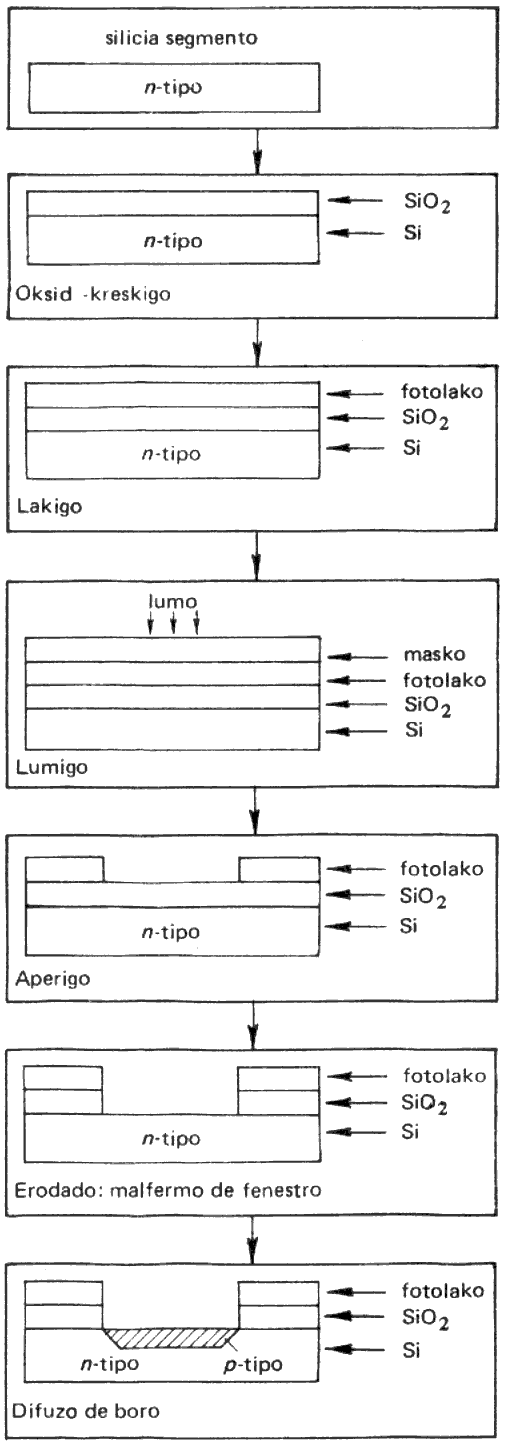 En la integritaj cirkvitoj la diverskarakteraj duonkonduktaj terenoj povas situi ne nur unu apud la alia, sed ankaŭ unu sub la alia. Pro tio la maskadon oni devas kelkfoje fari per diversaj maskoj, tiamaniere, ke la nova ilustraĵo konformu al la antaŭa. La precizeco de la konformeco influas la definitivajn dimensiojn de la cirkvito; hodiaŭ oni povas postuli ĉ. 1,5...2-mikrometran precizecon. Post la konformigo oni lumigas la segmenton tra la masko. Krom la priskribita metodo oni aplikas ankaŭ metodon de projekciado, kiam la maskon oni projekcias tra speciala lenso al la surfaco de la lumsensiva lako. Post la lumigo - simile al fotografia filmo - oni aperigas la lumsensivan lakon. Tiun etapon sekvas la erodado de la kvarcovitro. La malfermon de tiel nomataj difuzaj fenestroj kaj la difuzon montras fig. 4.