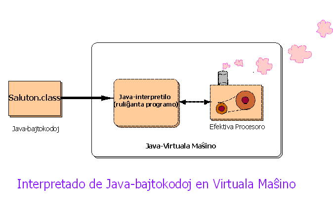 La "Java-interpretilo" en la ilustraĵo estas plenumebla programo ruliĝanta en la komputila sistemo. Ĉia komputila sistemo havas sian propran Java-interpretilon kiu ruliĝas en tiu specifa sistemo. La "Efektiva Procesoro" estas la reala aparatara procesora ico de tiu specifa komputila sistemo.