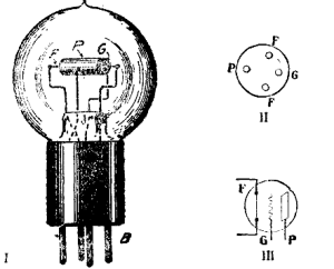 ![]() | Fig. 6. — 1. Ĝenerala aspekto de moderna radiolampo. — P, plato (aŭ anodo); G, krado (aŭ helpanodo); F, filamento (aŭ inkandeskanta katodo); B, kontaktiloj. La tri elektrodoj (plato, krado, filamento) estas entenataj en vitra ampolo sfero-, piro- aŭ cilindroforma, kiun subtenas metala aŭ izola cilindra ampolingo. Ĉe la malsupra parto de l' ampolingo elstaras ordinare kvar metalaj stangetoj, la kontaktiloj. Du estas interne konektitaj kun la ekstremaĵoj de la filamento, unu kun la krado, la alia kun la anoda plato. Ilia kutima lokigo estas montrita en II. La lampo estas en la skemoj reprezentata per la simbolo III. |