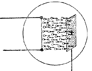 ![]() | Fig. 7. — La elektronoj elsaltas el inkandeskanta filamento. Kvankam ili estas absolute nevideblaj, ni prezentis ilin ĉi tie per kvazaŭ-fiŝetoj, kun kapo kaj vosto, por montri la direkton de ilia movo. |