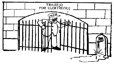 ![]() | Fig. 14. — La krado estas negative ŝargita rilate al la filamento. Malgraŭ la energia alvoko de l' anodo, la elektronoj ne povas trapasi la kradon, kiu forpuŝas ilin. |